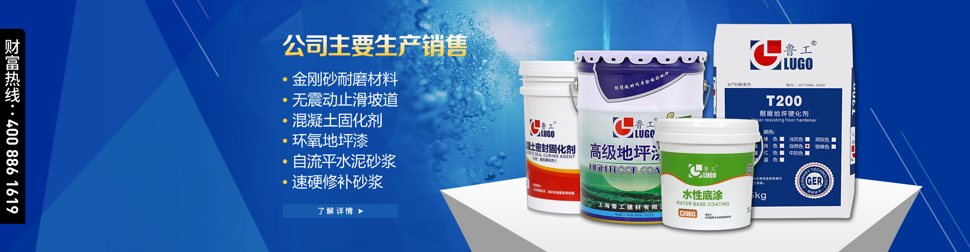 上海魯工建材有限公司——是一家集研發,生產,施工于一體的化學建材專業公司。產品主要包括環氧地坪,耐磨硬化地坪,運動場地,建筑干粉,以及建筑防腐,防水材料。 公司依靠科技人才優勢,采用進口原料,不斷開發新產品,并根據不同的客戶需要,從實際考慮設計恰當的方案,得到客戶一致認可,享有良好聲譽。 公司按照國家標準和行業標準,制定嚴格的生產流程和施工工藝,嚴格按照ISO9001國際質量體系生產施工,目前公司已全面實施一套現代化的科學管理模式,以確保企業健康,快速發展。 我們以“質量為先,誠信為本,服務為重”的 經營理念,以“精益求精,永無止境”的企業精神,為您提供優質產品和滿意服務。 ...